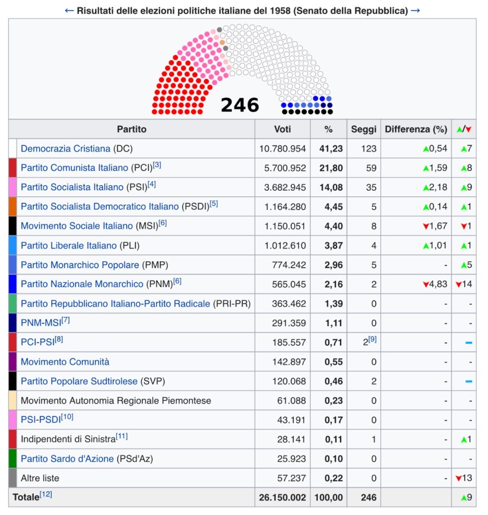 Risultati: Le elezioni politiche, svoltesi il 25 maggio 1958, non modificarono sostanzialmente il quadro politico. La DC guadagnava, rispetto al 1953, il 2,2% alla Camera e l’1,3% al Senato, incrementando di dieci unità il numero dei parlamentari. Consistente fu la tenuta del PCI, che incrementò percentualmente i suoi voti sia alla Camera (+ 0,1) che al Senato (+ 1,6), smentendo tutte le previsioni che ritenevano probabile un crollo comunista.