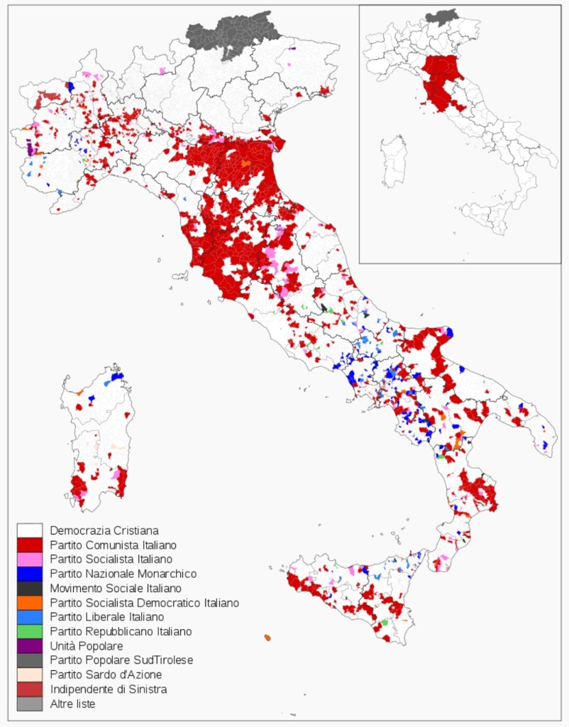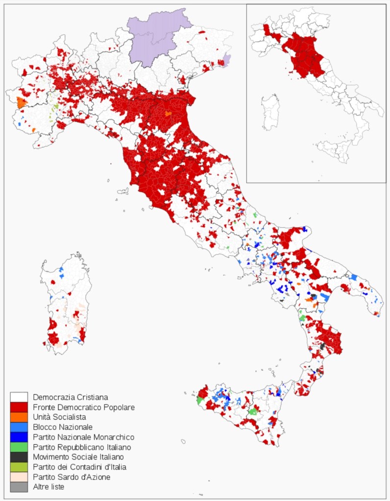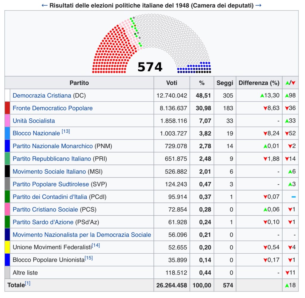 Risultati: il Fronte Popolare (PCI e PSI) si fermò al 31% mentre la Democrazia Cristiana da sola superò il 48% e con i suoi alleati centristi, arrivò a sfiorare il 55% dei suffragi. I Socialdemocratici, nati solo un anno prima da una scissione dal partito socialista, presero il 7%. Entrarono nel nuovo Parlamento anche i monarchici e i rappresentanti del Movimento Sociale Italiano, di chiara ispirazione fascista.