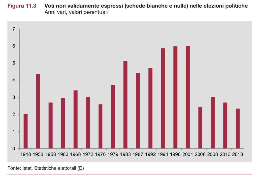 Anche i valori dei voti non validamente espressi possono essere collegati a questo aspetto. Infatti dalle elezioni del 1948 a quelle del 1958, in cui le percentuali di affluenza crescono e comunque si mantengono al di sopra del 90 per cento, i valori corrispondenti ai voti non validamente espressi risultano, con la sola eccezione del 1953, costantemente al di sotto della media complessiva della distribuzione (circa il 3,7 per cento del corpo elettorale). Solo nel 1953 infatti la percentuale dei voti validi per 100 votanti cala arrivando al 95,4%, mentre nell’elezione precedente era stata del 97,8% e in quella successiva subirà un innalzamento arrivando al 97,1.