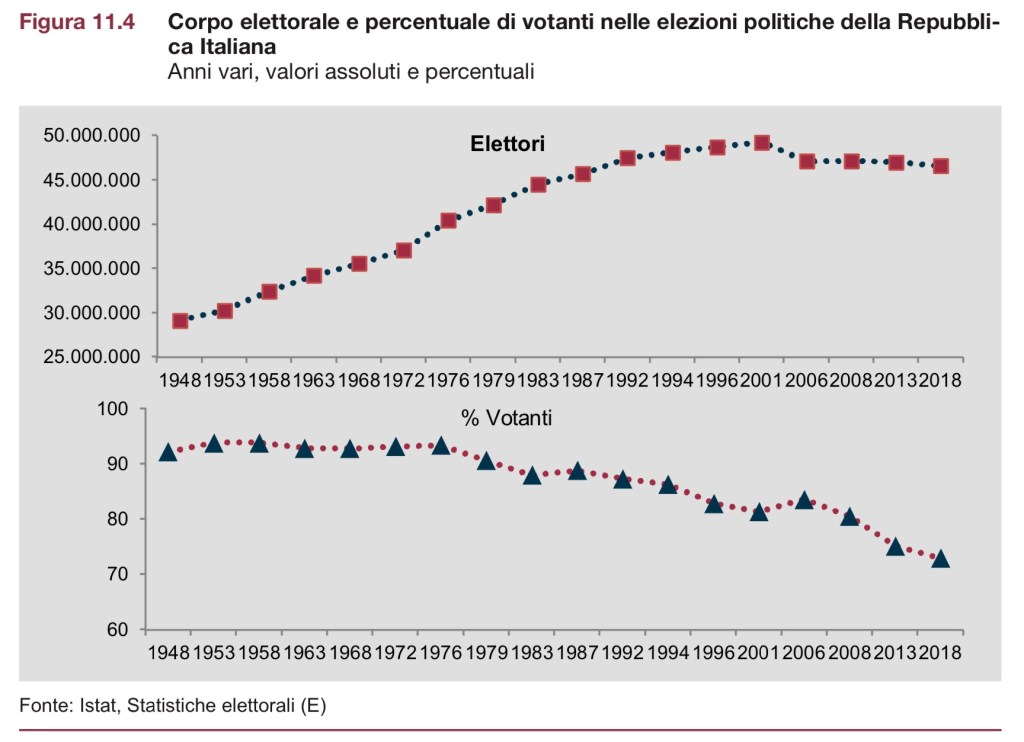 Un’osservazione a parte la merita il rapporto esistente tra l’evoluzione della consistenza numerica del corpo elettorale e la relativa affluenza alle urne. L’entità del corpo elettorale ha mostrato un incremento costante nella storia della Repubblica italiana: si è passati dai circa 27 milioni delle prime elezioni politiche repubblicane del 1948 agli oltre 28 milioni in occasione di quelle del 1953 per arrivare fino ai 30 milioni del 1958. Le percentuali di affluenza alle elezioni per la Camera e il Senato sono andate crescendo costantemente dal 1948 (92,23 per cento) fino al 1976 (93,39 per cento).